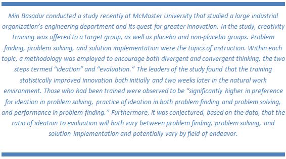 As you can see from the study, creativity training (when done well) can be instructive for employees who need to learn how to think and express ideas in a more positive, focused, and spontaneous way. Breakthrough results often occur when properly fueled by a rapid, flexible, and structured process at the front end of innovation.